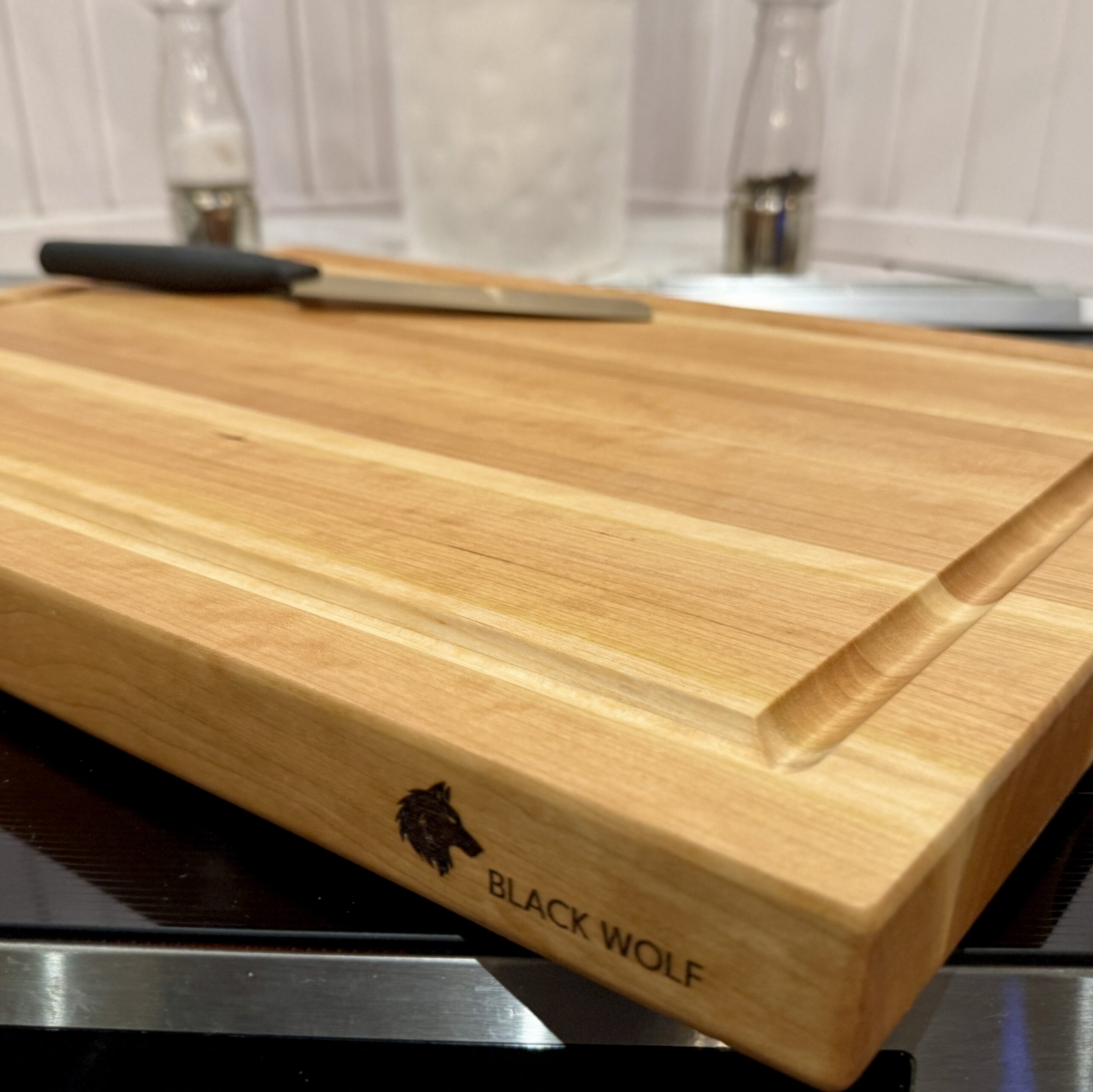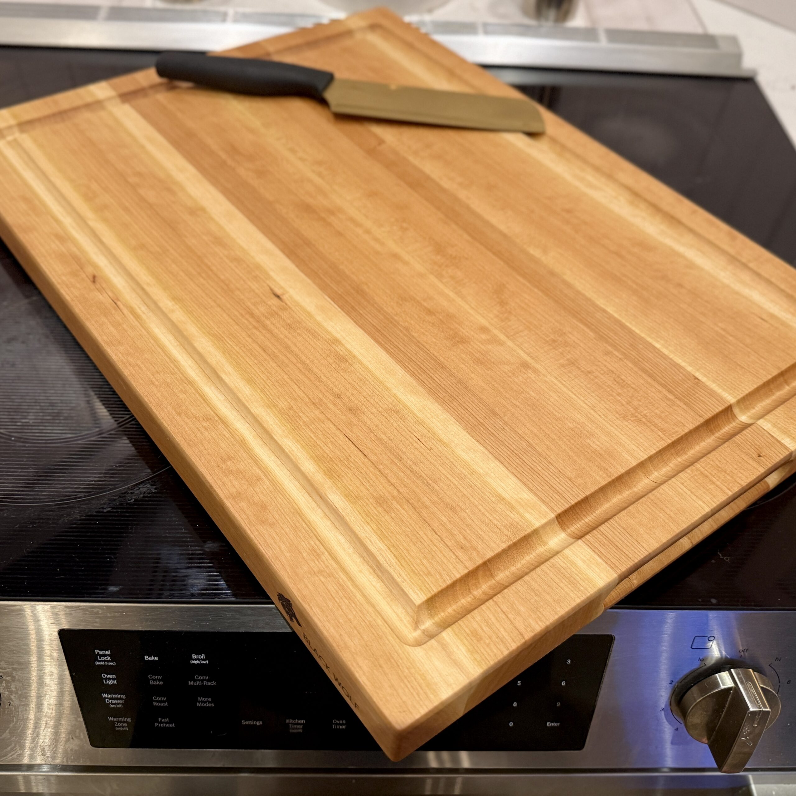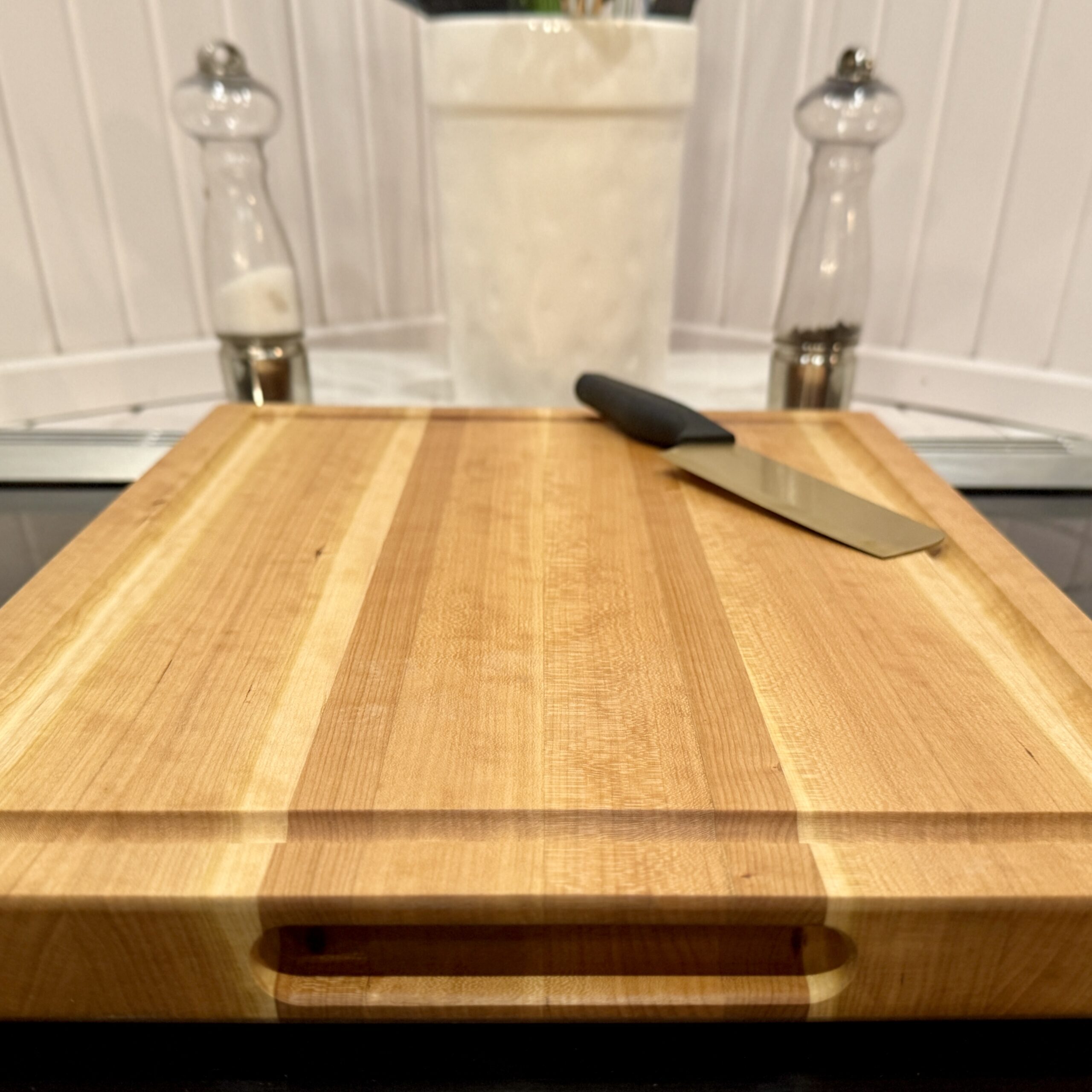 A cherry cutting board brings warmth, durability, and a timeless look to any kitchen. This handcrafted 22″ x 16″ edge‑grain board gives you a wide, stable surface for chopping, slicing, carving, and serving. Cherry’s smooth texture feels great under the knife and offers a consistent cutting experience.